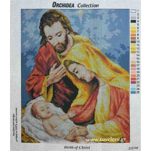 Κέντημα Η Γέννηση Του Χριστού 2525 τυπωμένο σε λευκό καμβά υψηλής ποιότητας από την ORCHIDEA. Ο καμβάς έχει περίπου 4 βελονιές/εκατοστό. Κεντιέται με κλωστές μουλινέ DMC. Αποτελείται από 25 χρώματα και μπορεί να τοποθετηθεί στους περισσότερους χώρους του σπιτιού σας.