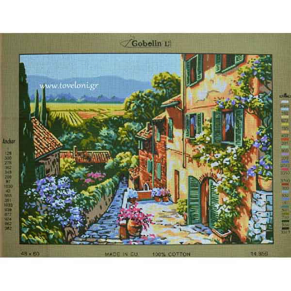 Κέντημα Σπίτια Με Λουλούδια 14856 τυπωμένο σε καμβά υψηλής ποιότητας από την GobelinL. Ο καμβάς είναι με περίπου 4 βελονιές/εκατοστό. Κεντιέται με κλωστές μουλινέ DMC. Αποτελείται από 18 χρώματα και μπορεί να τοποθετηθεί στους περισσότερους χώρους του σπιτιού σας.