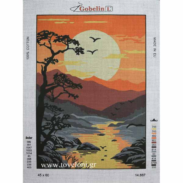 Κέντημα Τοπίο 14887 τυπωμένο σε λευκό καμβά υψηλής ποιότητας από την GobelinL. Ο καμβάς είναι με περίπου 4 βελονιές/εκατοστό. Κεντιέται με κλωστές μουλινέ DMC. Αποτελείται από 9 χρώματα και μπορεί να τοποθετηθεί στους περισσότερους χώρους του σπιτιού σας.